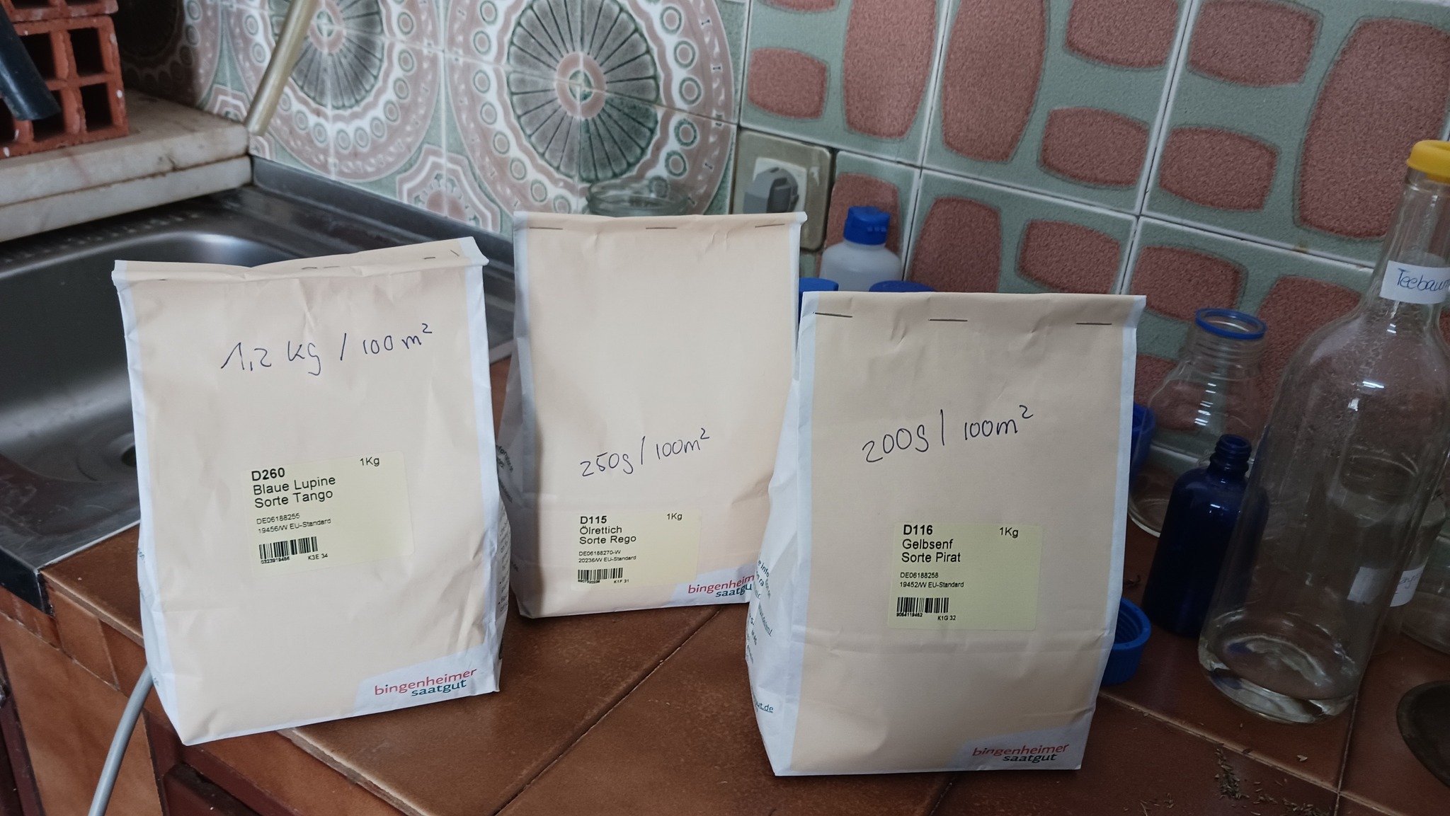 Im September konnten wir nach dem ersten Regen das Feld mal aufreißen, aber so nackig kann es über den Winter auch nicht bleiben. Der ausgiebige Regen am vergangenen Sonntag hat das Ganze noch schön aufgeweicht, jetzt noch mit dem Rechen glatt ziehen und Gründüngung drauf. Dafür hab ich mir Ölrettich, Gelbsenf und Blaue Lupine bestellt, Ringelblumen und Phacelia hatte ich noch, daraus mische ich was zusammen und verteile das mit einem Düngerstreuer. Soweit die Theorie.