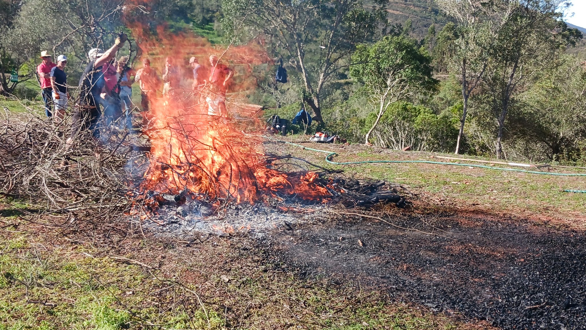 Bei unserem Workshop haben wir Terra Preta selbst hergestellt. Dazu wird ein Haufen Schnittgut angezündet und brennen gelassen. Wichtig dabei ist, dass eine hohe Temperatur erreicht wird, damit die Öle im Holz verdampfen. Nach einer Zeit hat man am Boden die Pflanzenkohle, der obere noch brennende Teil wird beiseite gezogen. Die Pflanzkohle wird gut abgelöscht, man will ja keine Asche produzieren.