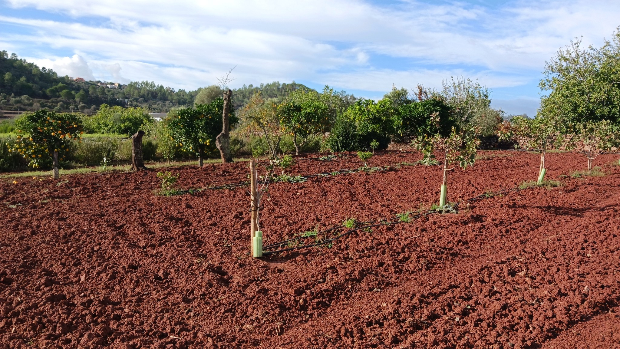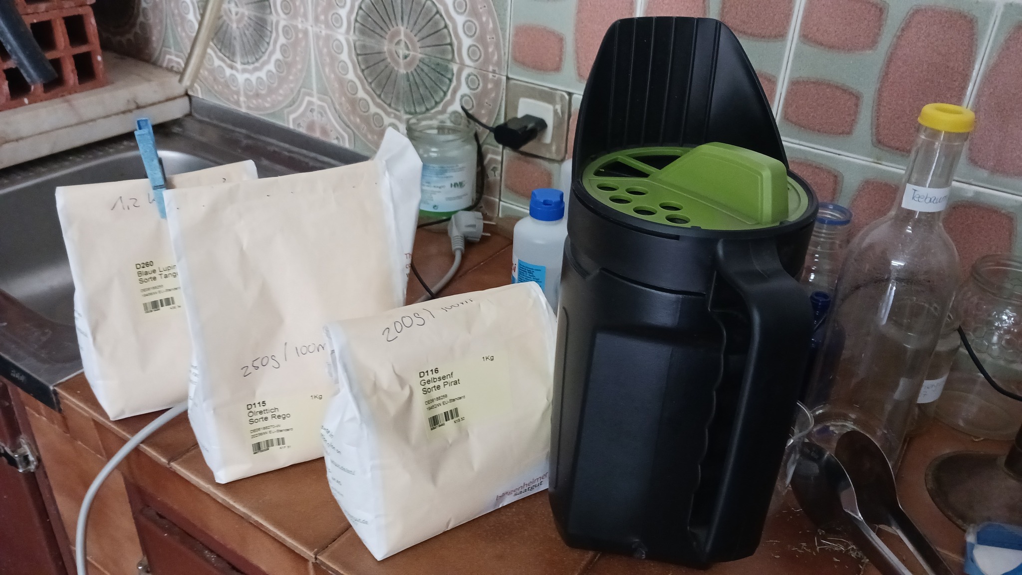 Im September konnten wir nach dem ersten Regen das Feld mal aufreißen, aber so nackig kann es über den Winter auch nicht bleiben. Der ausgiebige Regen am vergangenen Sonntag hat das Ganze noch schön aufgeweicht, jetzt noch mit dem Rechen glatt ziehen und Gründüngung drauf. Dafür hab ich mir Ölrettich, Gelbsenf und Blaue Lupine bestellt, Ringelblumen und Phacelia hatte ich noch, daraus mische ich was zusammen und verteile das mit einem Düngerstreuer. Soweit die Theorie.