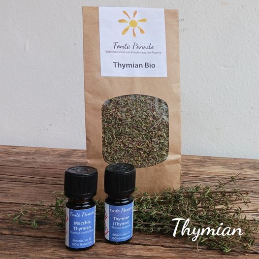 Thymian ist eine mehrjährige Pflanze, die zur Familie der Lippenblütler gehört. Die Gattung selbst umfasst mehr als 200 Arten. Wir haben bei uns den Echten Thymian (Thymus vulgaris) im Bio-Anbau und destillieren den Macchia-Thymian (Thymus mastichina) aus Wildsammlung.