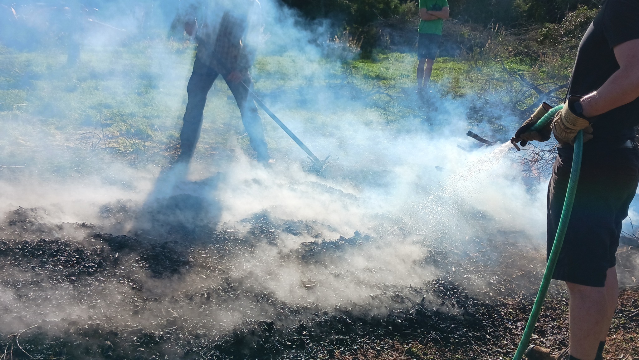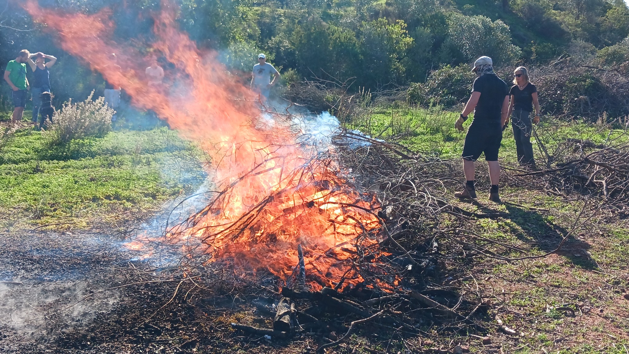 Bei unserem Workshop haben wir Terra Preta selbst hergestellt. Dazu wird ein Haufen Schnittgut angezündet und brennen gelassen. Wichtig dabei ist, dass eine hohe Temperatur erreicht wird, damit die Öle im Holz verdampfen. Nach einer Zeit hat man am Boden die Pflanzenkohle, der obere noch brennende Teil wird beiseite gezogen. Die Pflanzkohle wird gut abgelöscht, man will ja keine Asche produzieren.